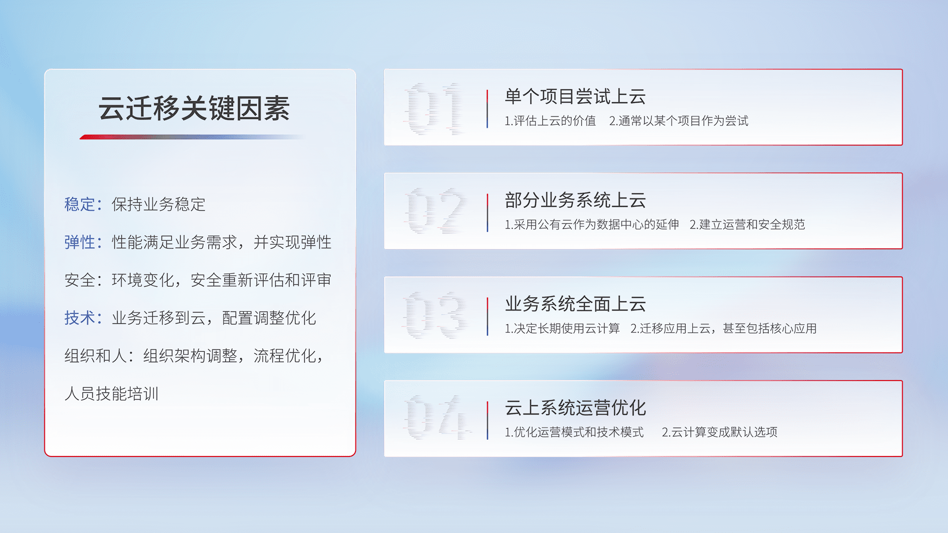 结合实际业务,,,,从规划设计、、云平台选型、、、云原生改造、、数据迁移、、、、集成交付,,迁移全过程为客户识别最佳上云路径,,做好风险识别管理,,,,设计网络架构、、、、身份权限、、、、安全审计合规、、、操作审计、、、、日志审计、、监控告警策略、、、多站点容灾设计等,,,,对云上基础设施进行整体规划,,,,提升IT治理水平,,,,以满足弹性、、、、高可用、、、、高性能的需求。。。。