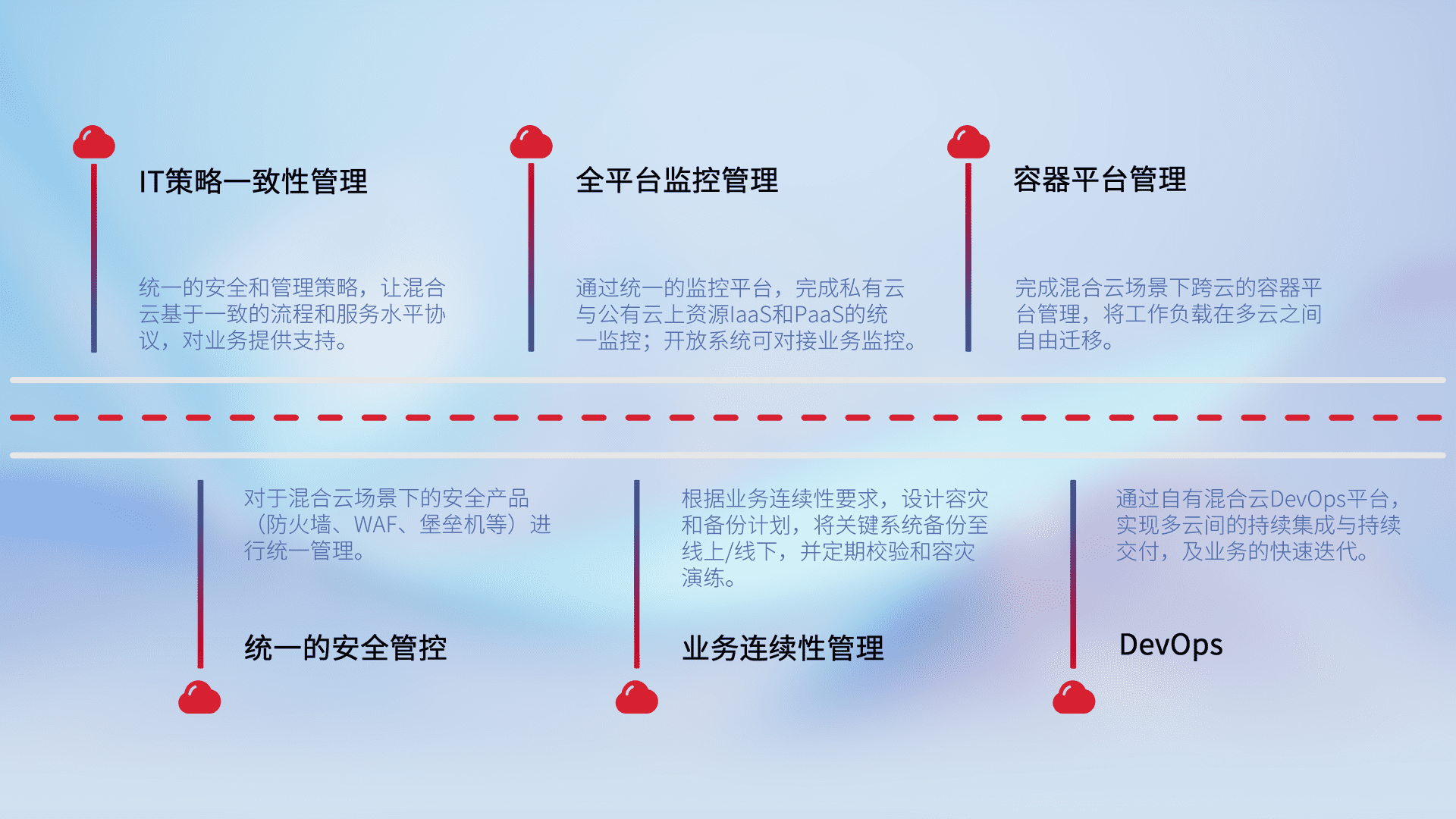 通过多云纳管,,以统一的资源数据模型把客户的云资源进行抽象和封装,,进而实现对多云资源的统一操作,,保障云资源管理的可靠性、、稳定性与可用性。。。。量身定制化运维内容,,,配置、、、开发运维、、、、补丁管理、、备份、、、、监控、、、、认证和访问管理、、、审计和日常巡检等,,保障在用云过程中的可靠度,,,,稳定度以及高可用率。。