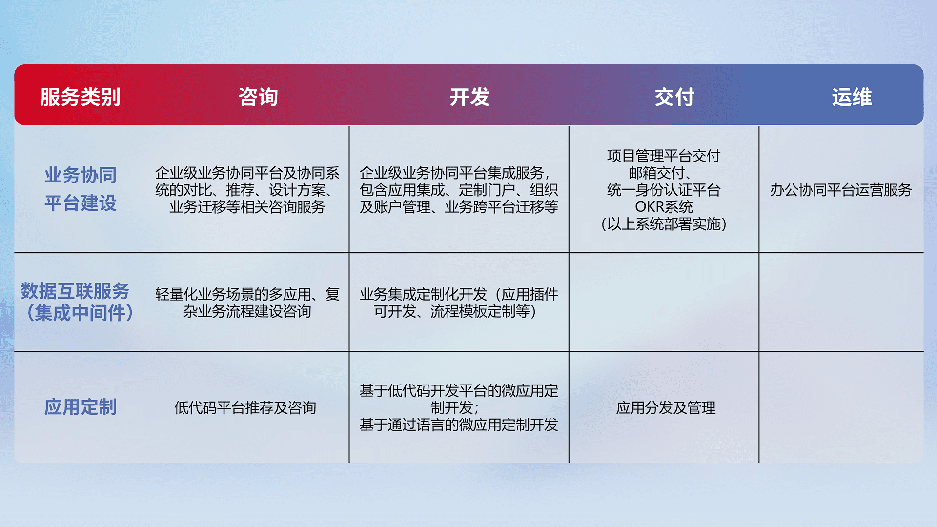 针对钉钉、、、、企微、、、、IDaas等平台级产品提供产品的规划、、、、方案、、交付、、、、定制化开发等服务,,,,实现如统一协同办公、、智能客户服务、、、混合会议管理、、、、智能数据查询、、等业务场景,,实现数字化转型。。。